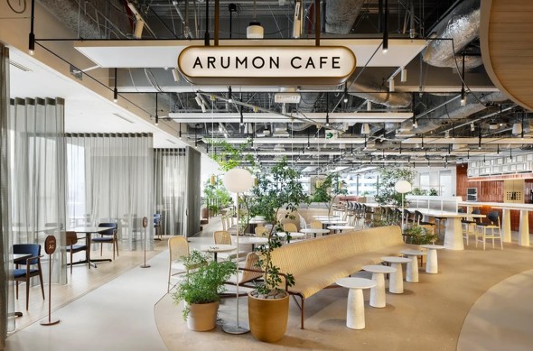 14階には野村不動産グループの社員が使える、健康に配慮したメニューを出すデリカテッセン・カフェとして「アルモン カフェ」が9月1日にオープンした。港町をデザインコンセプトにゆったりと空間を取り、居心地の良いコミュニケーションプレイスを目指している。