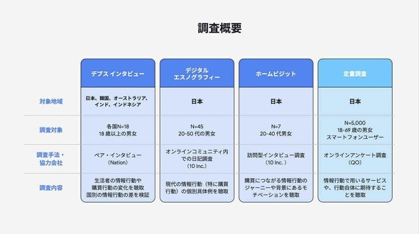 今回同社は、3つの買い物につながる人々の情報収集行動「サーチング」「ストリーミング」「スクローリング」に注目した。1〜6月にかけて定性調査を3種類実施。その結果、これら3つの行動が今、変化していることが明らかになった。