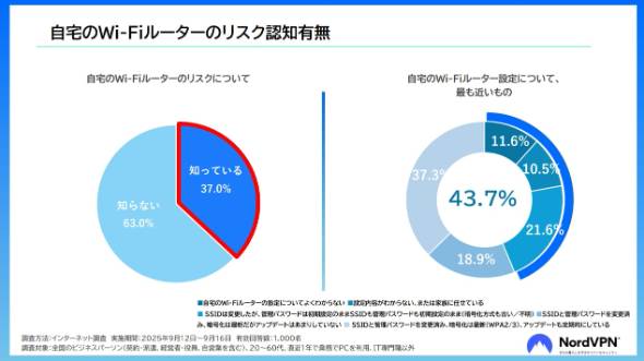 自宅のWi-Fiルーターについては、「リスクがある」と認識している人は37.0%にとどまった。自宅のWi-Fiルーターの設定については、「SSIDや管理パスワードを初期設定のまま利用している」が21.6%、「設定内容が分からない/家族に任せている」が10.5%と、セキュリティが不十分な状態の人が見受けられた。