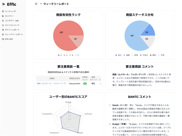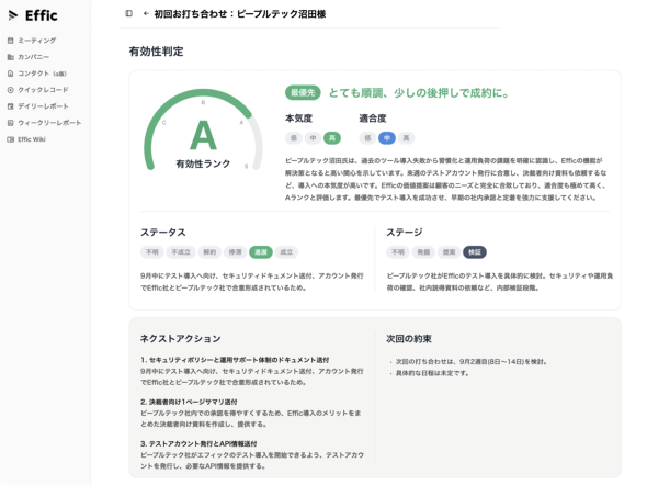 Efficは各商談を多面的に分析し、有効性をS・A・B・Cでランク付けする。本気度や適合度を判定し、次に取るべき具体的なアクションまで提示する。単なる議事録ではなく、商談の目的、予算、決裁者、競合など個別要素を構造化して分析する独自技術により、営業活動の質を定量的に評価できる。この構造化が、組織知の蓄積を可能にする蓄積された商談データからは、営業のベストプラクティスや各顧客との商談進捗情報が自動的に抽出される。どの競合にどう対応すれば勝てるのか、どのタイミングで何を聞くべきか。これらの暗黙知が、検索可能な組織の知識として残る。この仕組みが、若手の成長支援からマネジャーの組織運営まで、幅広い応用を可能にする。