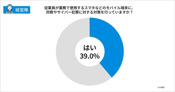 一方、モバイル端末への「対策を行っている」と答えた経営陣は39.0%にとどまった。具体的な対策は、PCと同様に「ウイルス対策ソフト導入」(84.8%)、「定期的な注意喚起」(41.4%)が上位だった。
