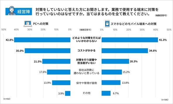 対策を行っていない理由としては、PCとモバイル端末のいずれも「どのような対策を行えばいいか分からない」(PC:42.8%、モバイル端末:41.3%)、「コストがかかる」(PC:35.0%、モバイル端末:34.6%)が多く挙がった。