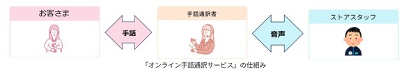 オンライン上の手話通訳者を介して、利用客は手話で、店舗スタッフは音声でコミュニケーションできるようになる。