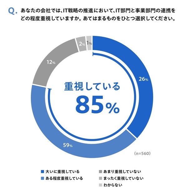 部門間連携について「大いに重視している」「ある程度重視している」と回答した企業は、合わせて85%に上った。