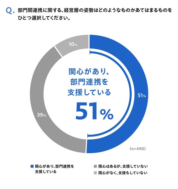経営層の姿勢については、「関心があり、部門間連携を支援している」と答えた企業は51%、「関心はあるが、支援していない」は39%だった。全体の9割が関心を持つ一方で、実際に支援する経営層は半数にとどまった。