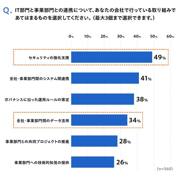 連携に関する具体的な取り組みでは、「セキュリティの強化支援」(49%)が最も多く、「全社・事業部門間のシステム間連携」(41%)、「ガバナンスに沿った運用ルールの策定」(38%)が続いた。「全社・事業部門間のデータ活用」は34%にとどまった。