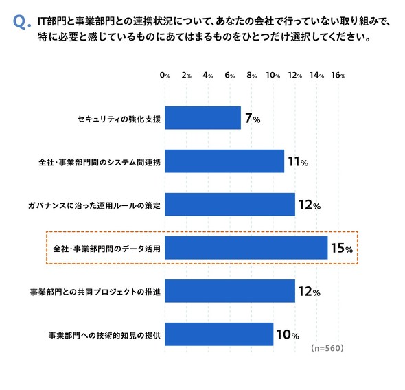 一方で、「現状行っていないが特に必要と感じる取り組み」として最も多く挙げられたのは「全社・事業部門間のデータ活用」(15%)だった。