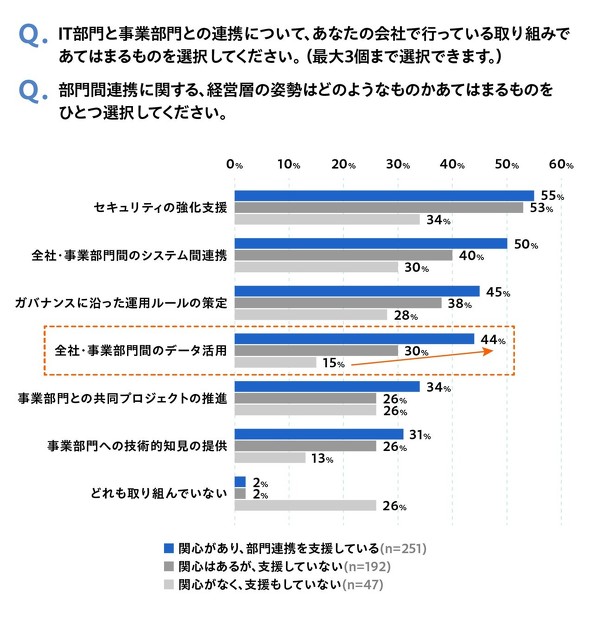 経営層が「部門間連携に関心あり・支援している」と答えた企業では、44%が「データ活用に取り組んでいる」と回答した。これに対し、「関心あり・支援なし」では30%、「関心なし・支援なし」では15%にとどまり、経営層の関心や支援がデータ活用の推進に影響していることが分かった。