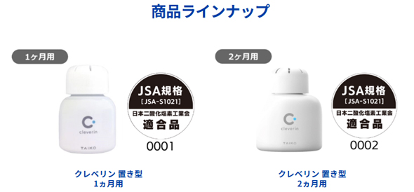 先ほどのブランドサイトで商品ラインアップを見ると、クレベリン置き型1カ月用と2カ月用の2製品の横に「JSA規格 日本二酸化塩素工業会」というマークが掲載されている。JSA規格というのは、「一般財団法人日本規格協会」が発行する民間規格である。