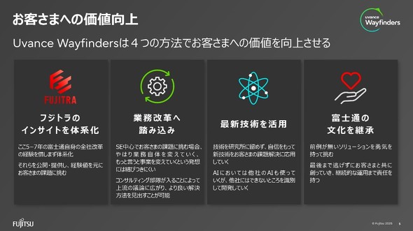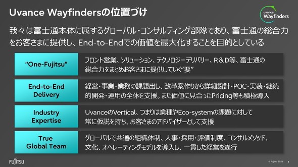 一方、同社が2024年2月に立ち上げたコンサルティング事業ブランド「Uvance Wayfinders」は、こうした子会社ではなく本体に統合した"内蔵型コンサル"として設計した。これは、フロント営業からソリューション、テクノロジーデリバリー、R&D(研究開発)まで、富士通のあらゆる機能を一体で連動させ、顧客に「One Fujitsu」として総合力を届けるための仕組みだ。