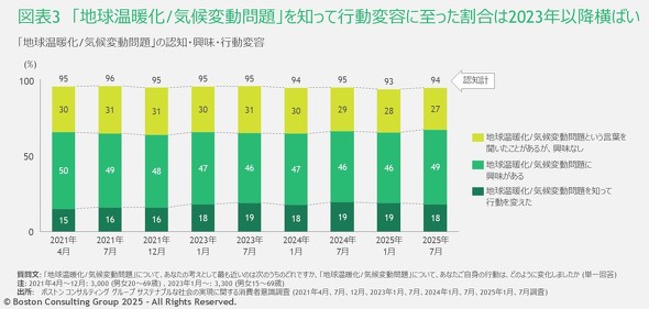 「地球温暖化/気候変動問題を知って行動を変えた」人は18%だった。これまでに行った同様の調査を見ると、2021年4月〜2023年7月にかけて緩やかに増加したが、2024年1月以降はほぼ横ばいで推移している。