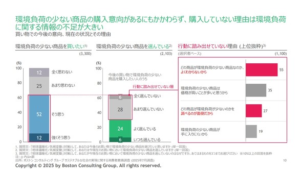 「環境負荷の少ない商品を選びたい」人は64%だったが、「実際に行動に移している」のはそのうち30%にとどまった。