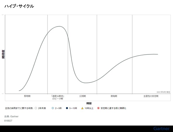 田原氏は米調査会社ガートナーが提唱した「ハイプサイクル」を引用し、AI技術におけるAIエージェントは「過度な期待のピーク期」に位置していると紹介。ハイプサイクルとは、新しい技術やイノベーションが登場し、社会に普及していく過程での「期待度」の変動を視覚化したものだ。