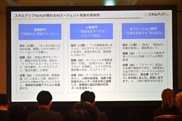 スキルアップNeXtは自社および顧客企業で、既にAIエージェントのビジネス活用を進めているという。以下がその一例だ。