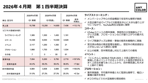 第1の要因は、コマース(物販)事業の最適化である。同四半期のコマース売上は103億9400万円に達し、当初見通しを上振れた。決算説明によれば、グッズ企画、プロモーションなどの好調に加え、事前・事後の販売を戦略的に実施し、受注商品の発送管理を徹底したことが奏功したという。