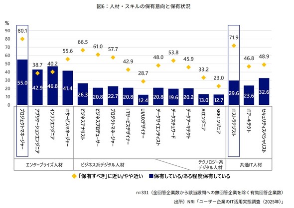 企業はどんな人材やスキルを備えるべきだと考えているのか。最も必要とされたのは「プロジェクトマネジャー」で80.1%に上った。以降、デジタル技術を理解してそれをビジネスに生かすことができる「ITストラテジスト」(71.9%)、業務プロセスや事業課題を分析し、最適なシステム要件を策定できる「ビジネスアナリスト」(66.5%)が続いた。