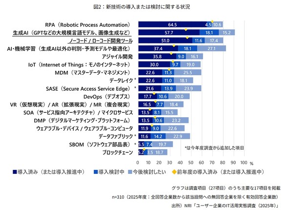 ソースコードを書かない、または最小限の記述でプログラム開発を行う「ノーコード/ローコード開発」の導入率は2024年度から4.9ポイント増加して51.0%に達した。野村総合研究所は「システム開発の効率化や、専門知識がないユーザーが自ら開発を行う『市民開発』における利用が拡大していると推測される」とした。