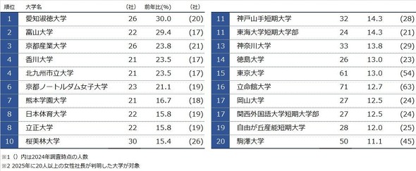 前年比で最も増加したのは「愛知淑徳大学」(26社、前年比30.0%増)だった。「富山大学」(22社、同29.4%増)や「香川大学」(21社、同23.5%増)など、上位20校のうち国公立大が6校を占めた 。
