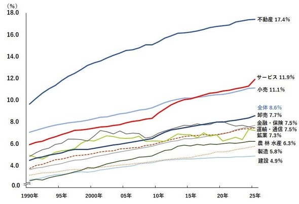 その他の7業種は「全体」(8.6%)を下回った。特に「建設」は4.9%と最も低く、唯一5%を下回った。「製造」は5.8%で、27年連続で下から2番目となった。