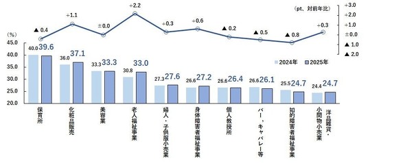 さらに細分類で見ると、「保育所」(39.6%)が最も高かった。以降「化粧品販売」(37.1%)、「美容業」(33.3%)といった美容関連業種や、「老人福祉事業」(33.0%)、「身体障がい者福祉事業」(27.2%)、「知的障害者福祉事業」(24.7%)などの社会福祉関連が上位を占めた。