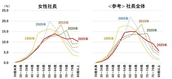 女性社長の年齢構成では「60〜64歳」(14.0%)が最多だった。「70〜74歳」(11.5%)は前年より低下した一方で、「75〜79歳」は上昇した。「75歳以上」は22.2%で、2020年時点(18.4%)から3.8ポイント増加した。なお、男女合計では「55〜59歳」(15.1%)が最も多かった。