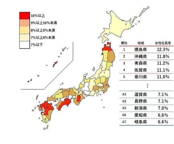 一方で、最も低かったのは「岐阜県」「愛知県」(いずれも6.6%)で、下位5県は製造業の割合が高い中部・北陸エリアが目立った。