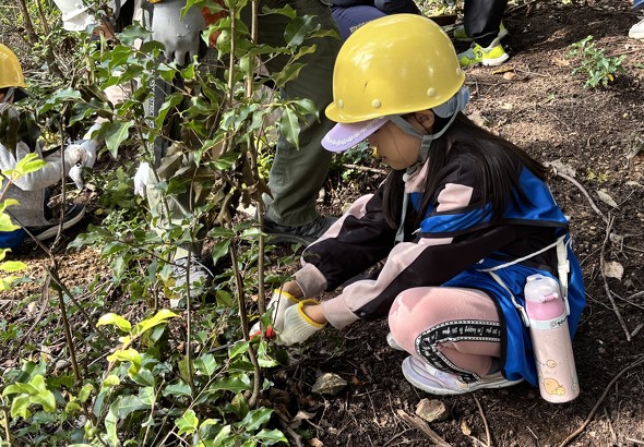 午後の森林保護活動「森を守ろう」では、公園内の山林で剪定作業を体験。樹木・環境ネットワーク協会のメンバーが指導し、子ども達は生い茂った枝を切ったり、拾った枝を保護者に見せたり、昆虫を探したりと自然の中での時間を楽しんだ。