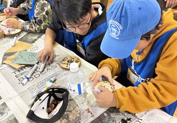 ファミリーキャンプ最後のプログラムは、木製コースター作りだ。子ども達だけが木工研修館に集まり、保護者へのサプライズプレゼントとして製作に取り組んだ。薄い円形に切られた木材をやすりで丁寧に整え、表面には「お母さんいつもありがとう」といった感謝のメッセージやイラストを描く。その間、保護者には別室で懇談の時間が設けられた。