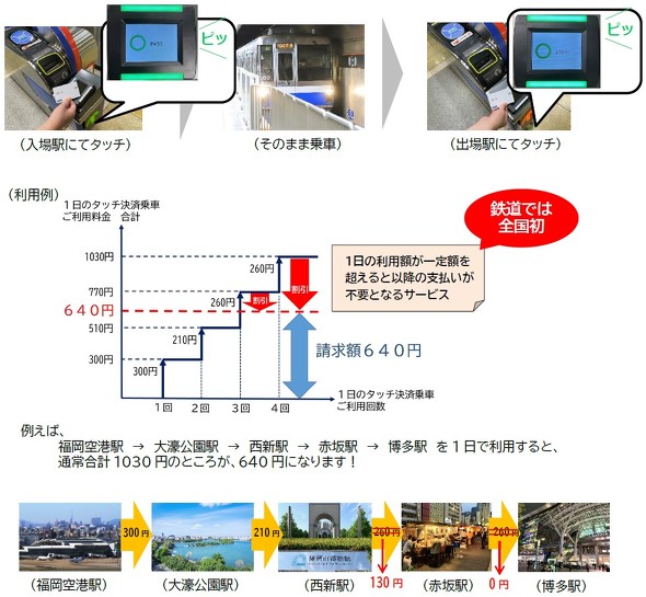 福岡市地下鉄は2023年7月7日より、同じ日に同じカードで利用したタッチ決済の総額が640円を上回った場合、クレジットカードへの請求額を640円とするサービスを始めた。この金額は、同地下鉄の一日乗車券の値段と同額。つまりは、手持ちのクレジットカードを割引乗車券の一つとして使えるのだ。