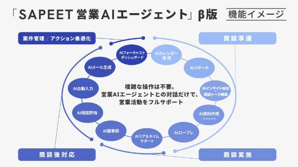 接客DXソリューションを展開するSapeet(東京都港区)は2026年1月、BtoB営業組織向けの「SAPEET 営業AIエージェント」β版の提供を開始する。専門家の知見をAIで再現する「Expert AI事業」の一環。商談準備からリアルタイム支援、事後フォローまで営業活動の最適化を図ることで、機会逸失の防止を支援する。
