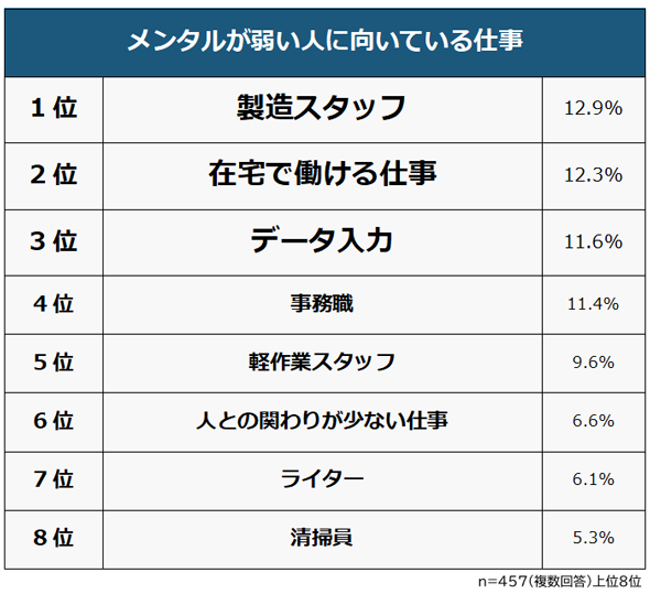 メンタルがあまり強くないと感じている457人を対象に聞いたところ、「実際に経験したことがある、メンタルが弱い人に向いている仕事」1位は「製造スタッフ」(12.9%)で、「職場でつらいと感じるとき」の1位は「怒られるとき」(16.0%)だった。