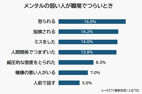 「メンタルの弱い人が職場でつらいのはどんなときか」を聞くと、1位「怒られるとき」(16.0%)で、以下2位「指摘されるとき」(14.2%)、3位「ミスをしたとき」(14.0%)、4位「人間関係でつまずいたとき」(13.8%)が続いた。