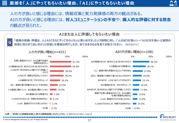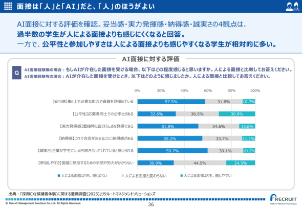 AI面接に対して「公平性」や「参加しやすさ」を感じる学生も一定数いる。「人の面接のほうが緊張する」(36.1%)といった理由で、AI面接を好む学生がいることも明らかになった。