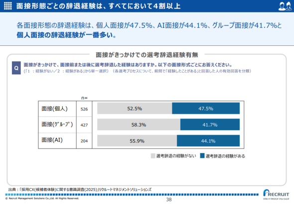 また、AI面接を理由に選考を辞退した学生は44.1%に上った。辞退理由の最多は「この面接方法で合否が決まることに納得できない」(23.3%)だった。なお、個別面接の辞退経験は47.5%、グループ面接は41.7%と、いずれの形式でも辞退経験が4割を超えており、AI面接だけが極端に高いわけではないこともうかがえた。