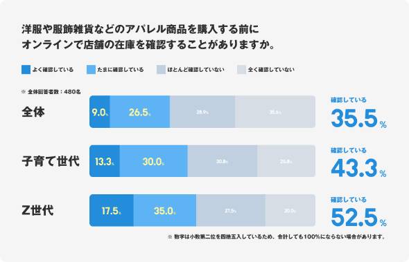 洋服や服飾雑貨などを購入する際、事前にオンラインで店舗在庫を確認する人は全体の35.5%に上り、約3人に1人が在庫を確認していることが分かった。年代別に見ると、20代以下の女性が57.5%と最も高く、次いで30代男性が53.8%となった。