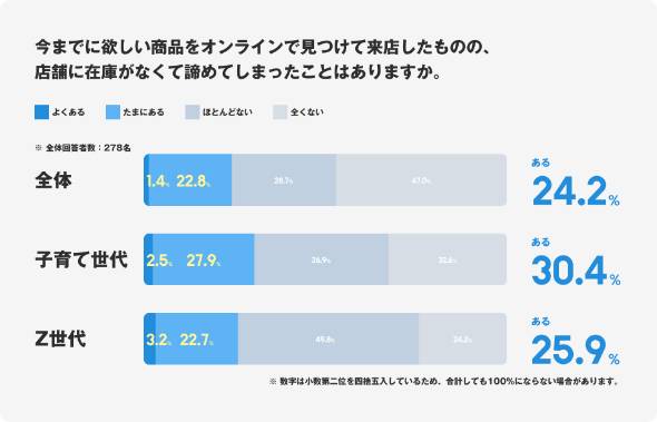 一方、オンラインで店舗在庫を事前確認しない人のうち、「オンライン上で欲しい商品を見つけて来店したものの、店舗に在庫がなく購入を諦めた経験がある」と答えた人は24.2%に上った。