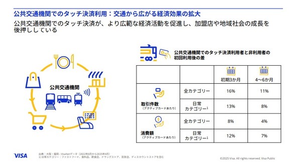 大阪と福岡で過去12カ月間、タッチ決済利用者の行動を追跡調査した結果、公共交通機関でタッチ決済を使い始めた利用者は、使わない利用者と比較して、最初の3カ月間で取引回数が13%多く、消費額も12%多かった。この差は一時的なものではない。利用開始から6カ月後でも取引回数は8%多く、消費額は7%多い状態が続いている。