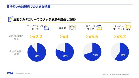 実際、日常的な支出カテゴリーでタッチ決済は急速に浸透している。コンビニエンスストアでのタッチ決済の利用比率は90%に達し、飲食店では約80%、ドラッグストアで70%、スーパーマーケットで約60%となった。