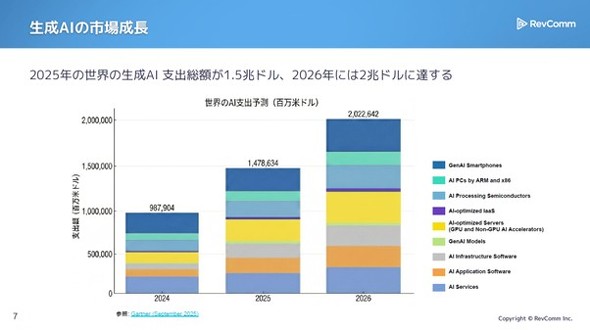 2025年の世界の生成AI市場規模は約1.5兆ドルに達する見込みだという。2024年の約1兆ドルから1.5倍の成長であり、2026年にはさらに2兆ドルに達するとの分析もある。