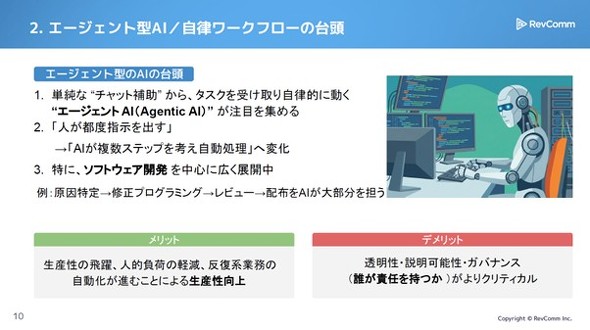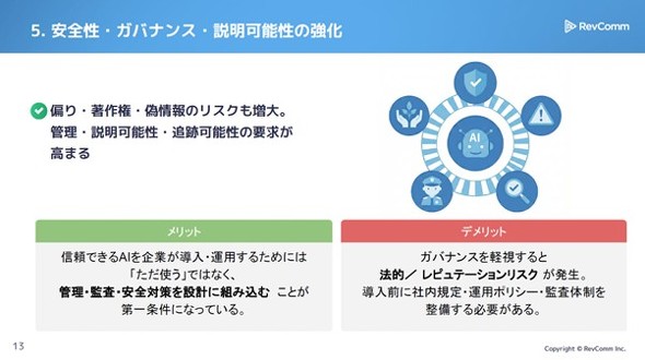 こうした状況について、音声解析AIなどを手掛けるRevComm(東京都千代田区)取締役 執行役員 リサーチディレクターの橋本泰一氏は「過剰投資になる可能性はあるものの、主要プレイヤーは辞められない状況にある。黒字化よりも普及を優先する状況は当面続き、技術革新と並行して持続可能性を担保できるかが焦点となる」と指摘する。