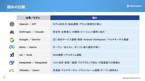 そして2025年に飛躍的に成長したのが、イーロン・マスク氏率いるxAIや、DeepSeek、Alibabaといった新興勢力だ。xAIはSNS「X」とのリアルタイム連動、中国発のDeepSeekはコスト効率重視のアプローチなど、各社独自の強みを打ち出している。
