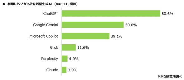 対話型生成AIの利用経験者111人に利用したことがある生成AIを尋ねると、1位が「ChatGPT」(80.6%)、2位が「Google Gemini」(50.8%)、3位が「Microsoft Copilot」(39.1%)となった。