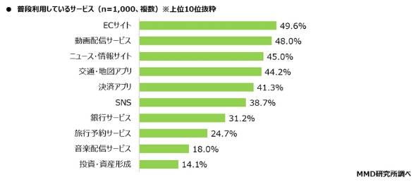 普段利用しているサービスについては、「ECサイト」(49.6%)が最も多く、次いで「動画配信サービス」(48.0%)、「ニュース・情報サイト」(45.0%)となった。