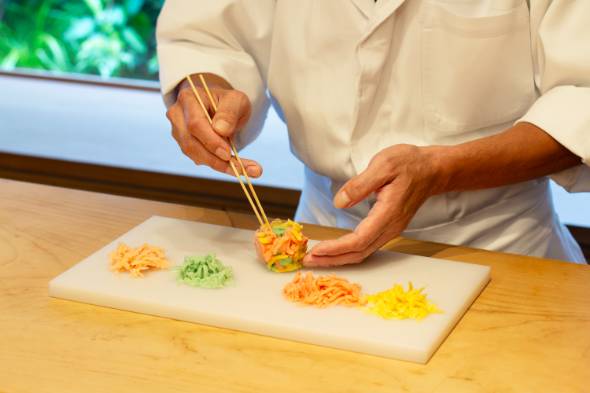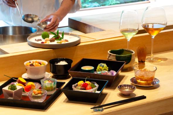 一番出汁を味わう「出汁体験」、料理長が目の前で葛切りを仕上げる「職人の技体験」、抹茶を点てる「茶の湯体験」、和菓子で枯山水を完成させる「庭づくり体験」の4つとなる。