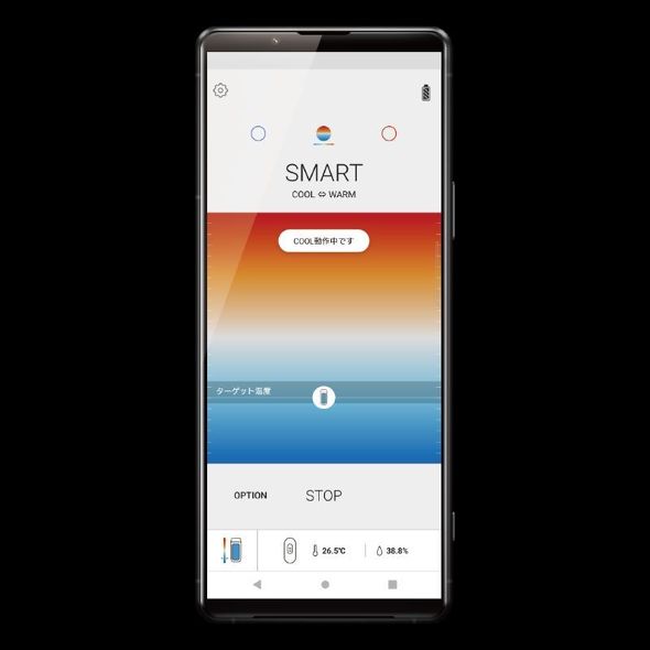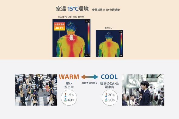 5月に発売したREON POCKET PROの市場推定価格は3万円前後。冷却はレベル1〜5の5段階、加温はレベル4まで4段階に調節できる。充電時間は200分だ。持続時間は冷却のレベル1で約34時間、レベル5で約5.5時間。加温の場合はレベル1で約10時間、レベル4で約5.5時間である。35度の室内環境では、体表面部分を22.6度まで下げられるという。センサーが付いており、スマホでターゲット温度を設定すると、冷却と加温を自動で切り替えられる。
