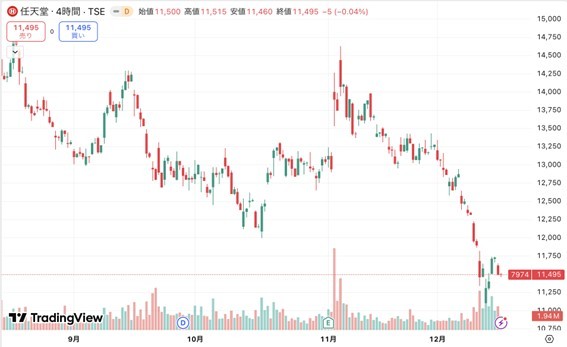 この変化の影響が顕著に表れている企業の一つが任天堂だ。同社は11月に業績の上方修正を発表したばかりだが、メモリ価格の高騰が次世代機「Nintendo Switch 2」の採算性を圧迫するのではないかとの懸念から、株価は急落。上方修正で上げた値幅の倍以上を吐き出す局面となった。