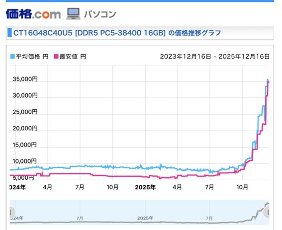 市場価格の変動は、もはや通常のインフレの範囲を超えつつある。市場データによると、2025年10月時点で約8000円だったDDR5メモリ(16GB)の平均価格は、わずか2カ月後の12月には3万5000円前後まで上昇した。短期間で約4倍超という異例の値上がりである。