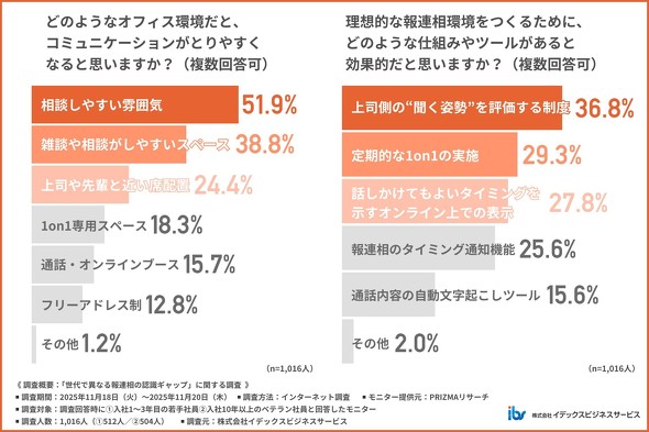 若手社員・ベテラン社員の双方に、コミュニケーションが取りやすいオフィス環境について聞いた。「相談しやすい雰囲気」(51.9%)が最多で「雑談や相談がしやすいスペース」(38.8%)、「上司や先輩と近い席配置」(24.4%)、「1on1専用スペース」(18.3%)が続いた。