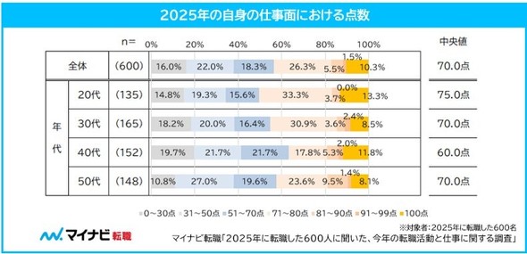 2025年の自身の仕事面を100点満点で表すと、全体の中央値は「70.0点」だった。年代別で見ると、20代が中央値「75.0点」で最高、40代が「60.0点」で最低だった。
