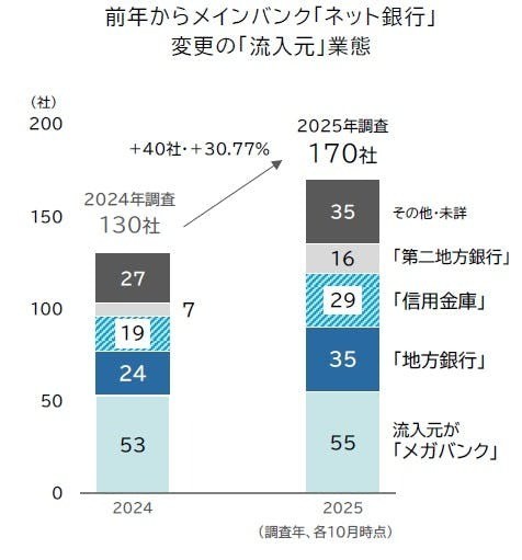 2024年からメインバンクをネット銀行に変更した170社を調べると、流入元は「メガバンク」(55社)が最多で、「地方銀行」(35社)、「信用金庫」(29社)が続いた。